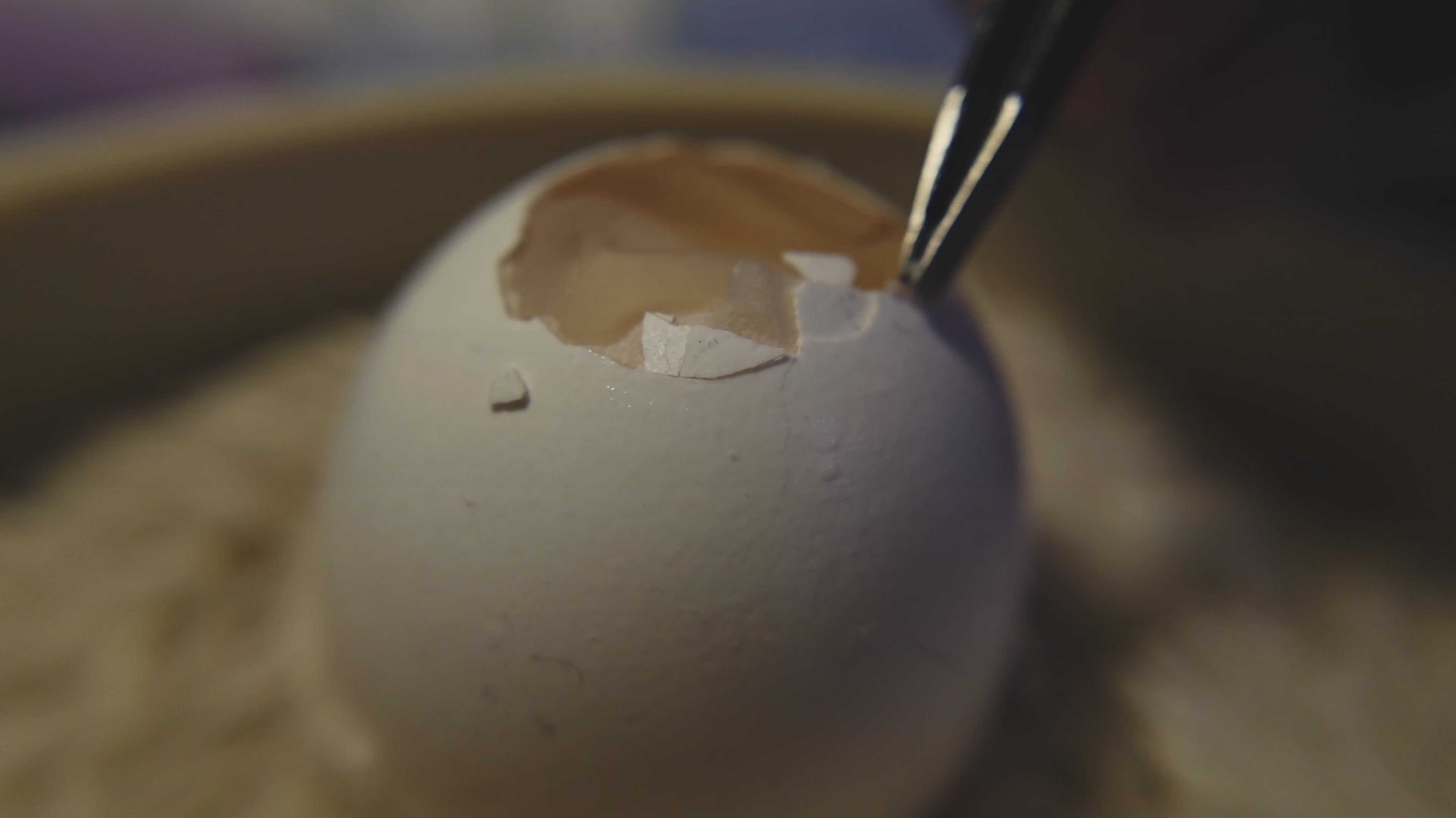 Step 3 with a soft or rounded tweezer gently remove the loosened egg shells from the membrane and continue on until you completely removed all of the egg's shell from the egg itself protecting the egg in the inside